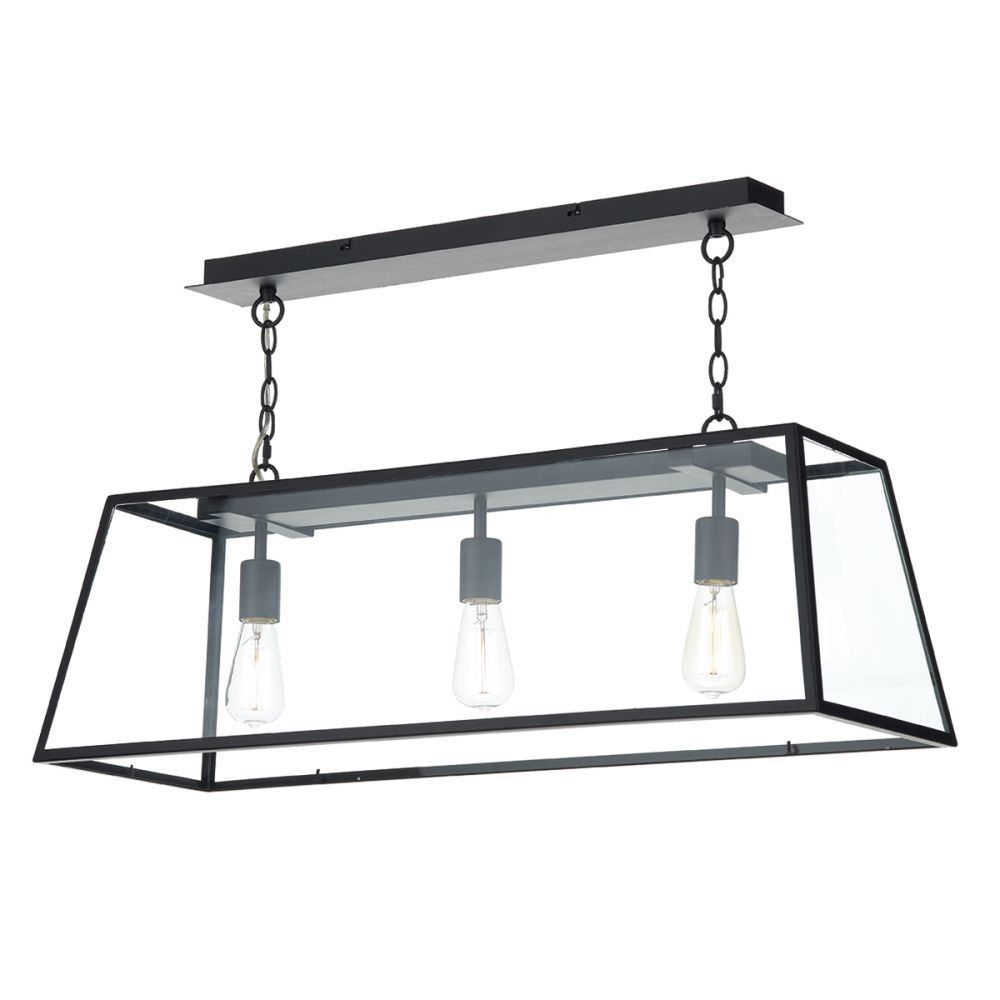 The ACADEMY 3lt bar pendant has a matt black ceiling plate and frame with clear glass panels. Perfect for use over kitchen islands or dining room tables and looks especially good when used in conjunction with vintage style lamps, available to buy separately.