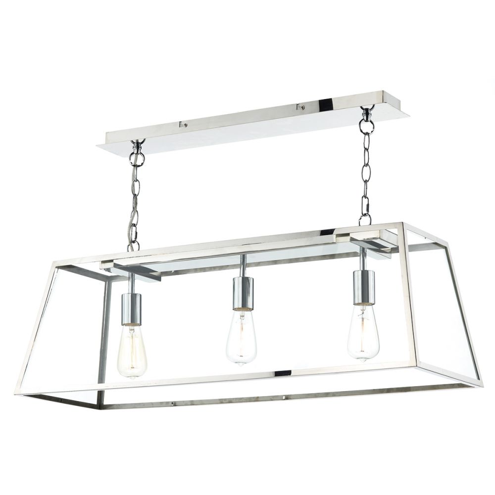 The ACADEMY 3lt bar pendant has a Stainless Steel ceiling plate and frame with clear glass panels. Perfect for use over kitchen islands or dining room tables and looks especially good when used in conjunction with vintage style lamps, available to buy separately.