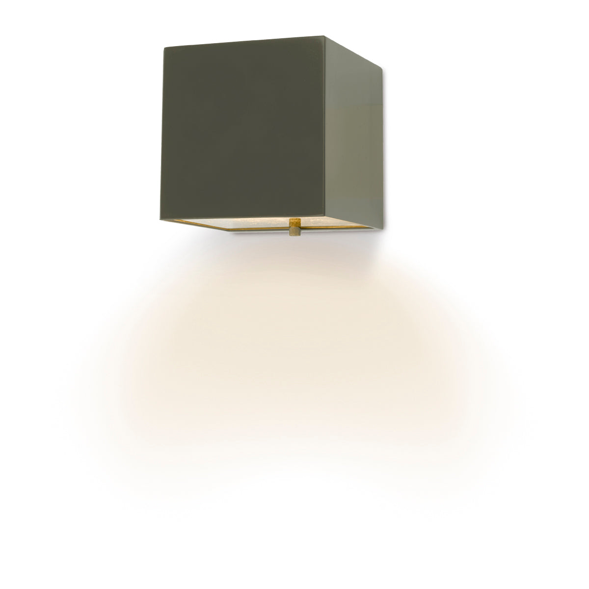 The Bacchus outdoor wall light features a matt warm silver, industrial-inspired design with a cuboid shape.