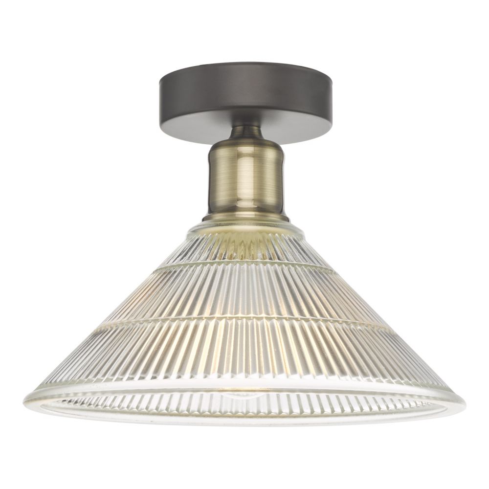 The Boyd flush ceiling light with prismatic shade and antique brass detail. Is a great looking soft industrial flush light specifically designed for low ceilings, it’s a small lamp that can find a home anywhere and can look great in multiples in larger rooms.