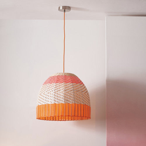 Handwoven from delicate natural rattan together with coloured synthetic rattan this cloche-shaped ceiling pendant light, has been lovingly crafted in collaboration with Designers Guild to sit perfectly with their iconic interior fabrics and wallpapers. The stunning woven pendant in shades of orange, pink and white, allows the light to shine through creating a soft glow throughout your interior. The pendant light adds a touch of vibrant colour to your interior setting and is complemented with a orange fabric flex.
