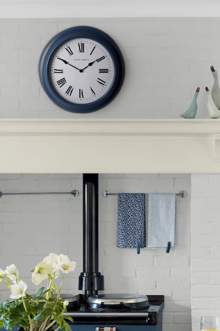 The Brookvale wall clock by Laura Ashley is available in two finishes, A stunning large Roman numeral wall clock with a moulded metal case with a matt painted finished. The classic Roman dial and traditional metal hands measure time behind a flat glass lens. Batteries not included.