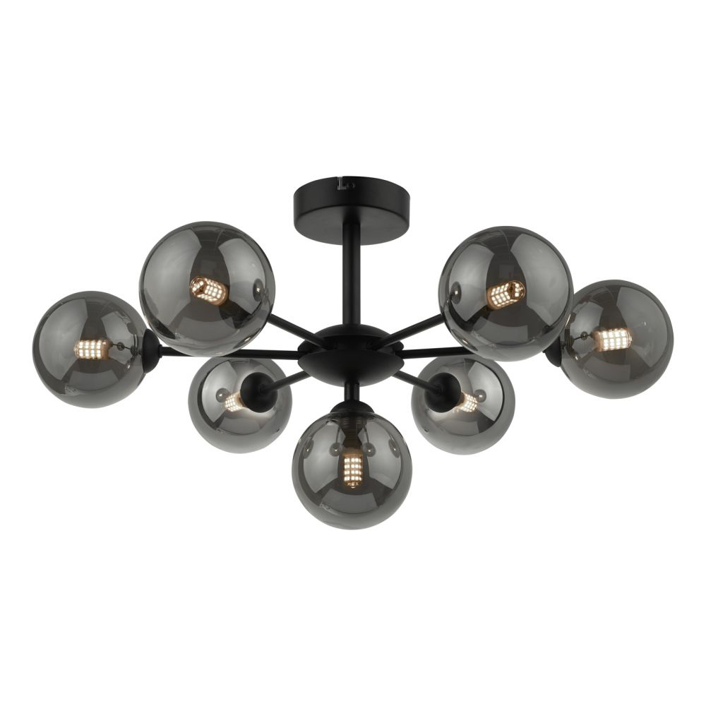 The Cohen 7 light semi-flush ceiling light in matt black and brilliantly reflective smoked glass shades is a more modern stripped down take on the sputnik chandelier popularised in the sixties when the space race was capturing the imaginations of designers and home owners alike.