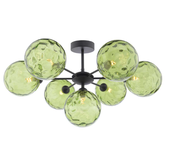 The Cohen 7 light semi-flush ceiling light in matt black and large Green glass shades is a more modern stripped down take on the sputnik chandelier popularised in the sixties when the space race was capturing the imaginations of designers and home owners alike.