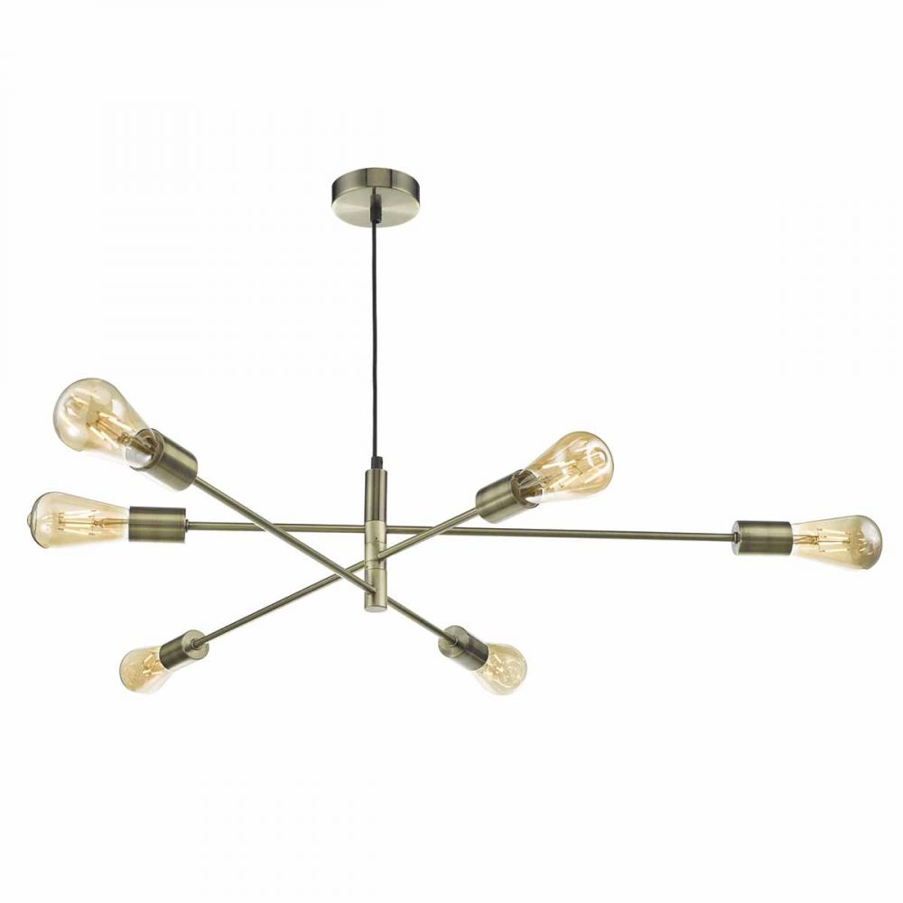 With a diameter of almost 1 metre and adjustable from 25 to 120cm in height, the Alana six-light pendant can make a strong statement in rooms with both low and high ceilings. Finished in antique brass for an authentic industrial look. Pictured with our Rustika lamps (sold separately), the look of this pendant can be changed by using different lamps such as oversized globes. The black cloth-covered cable can be adjusted on installation.