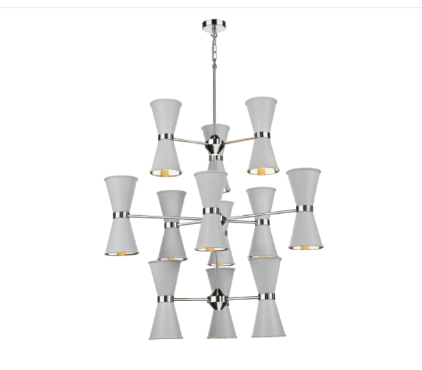 Its simple design lends itself to many interior design schemes, the solid brass is finished in a polished chrome on the inside giving a beautiful glow to the room and the outer shade is painted in one of four neutral colours. The chandelier shades have bulbs pointing up and down so it can be an extremely bright light if needed and its always possible to dim with a dimmable bulb.