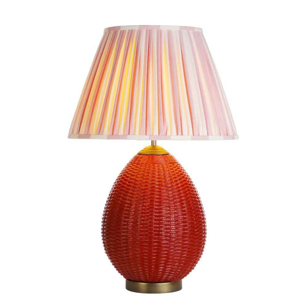 The Lombok table lamp is a new lamp base from David Hunt Lighting its a lovely textured item with a vibrant strawberry red finish rattan effect, the base is sold on its own and you can team it up with any shade, its shown here with the pleated shade 40 cm which comes in many variations and a choice of interior lining.
