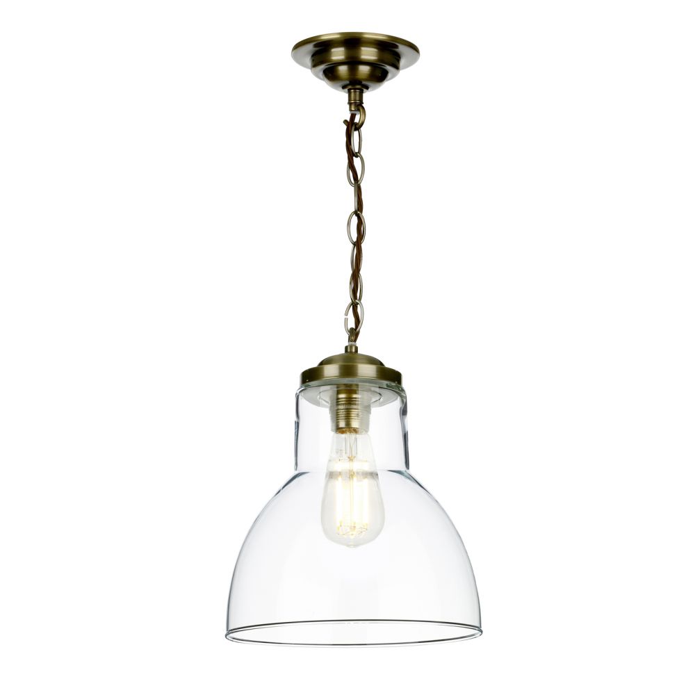 The Upton single pendant comes with a crystal clear glass shade, and antique brass metalwork with a chain. Bespoke made to order in the Cotswolds, its a simple design that will not blend in well with any room decor. it would look good in a hallway, bedroom, kitchen or bar area