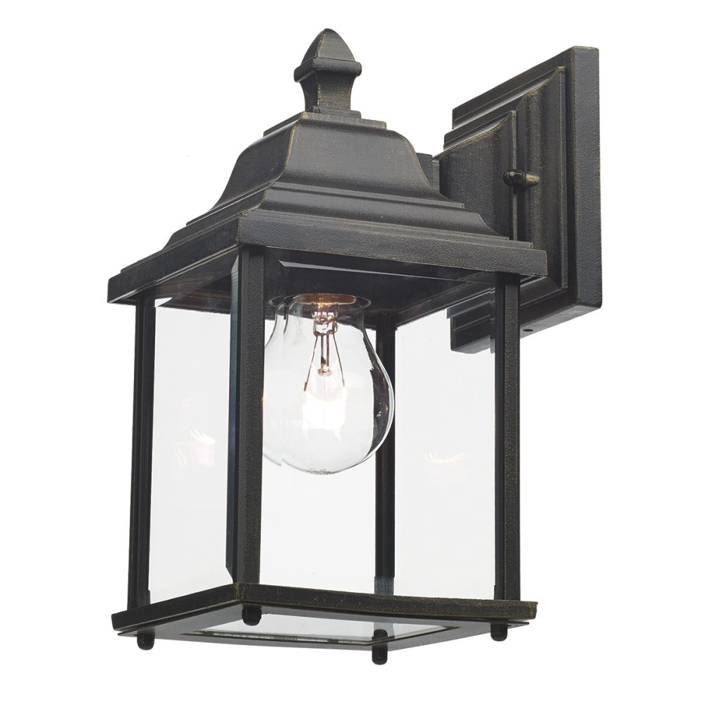 Elegantly finished with a black/gold patina, the DOYLE Outdoor Wall Light features clear, bevelled edge glass and decorative finial.