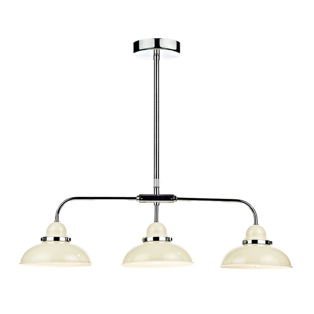 The DYNAMO 3lt Pendant features a polished chrome ceiling plate and a metal retro-styled shades in cream.