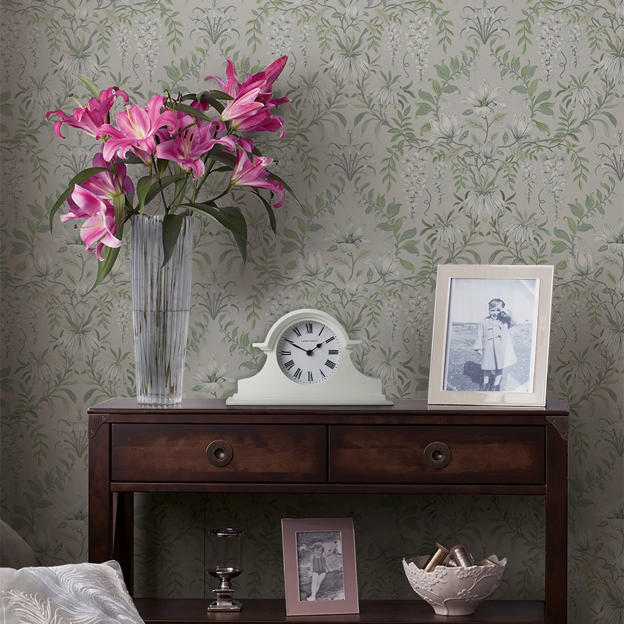 The Edith manual clock is a classic design from Laura Ashley shown in soft ivory.