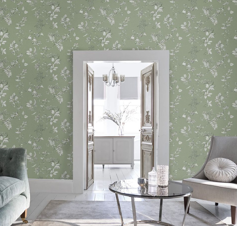 A fresh and contemporary twist to Laura Ashley's heritage Elderwood design. The hand drawn illustrative blossom and berries stand out beautifully against a beautiful sage green background.