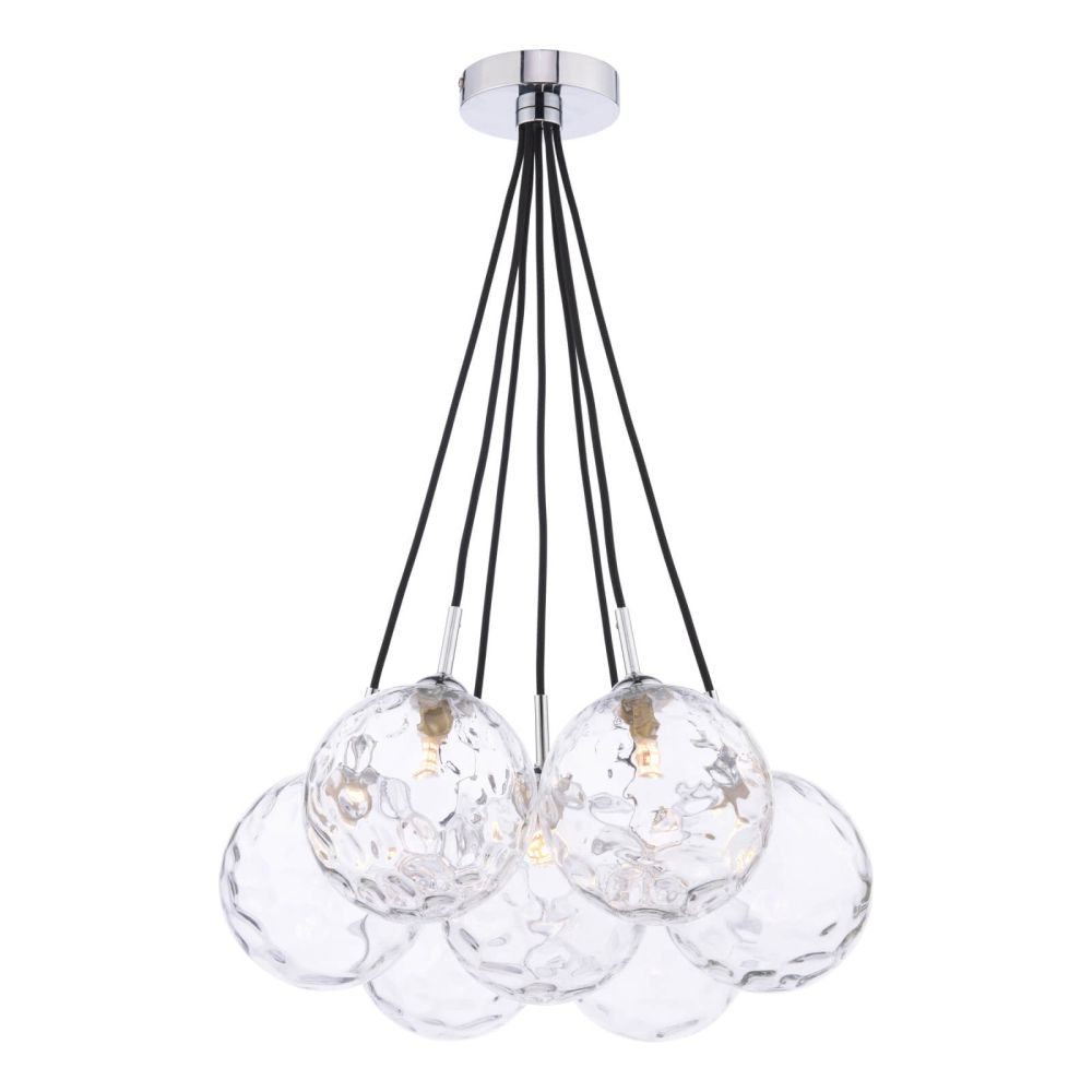 The Elpis chandelier is a seven-light cluster pendant with a polished chrome ceiling plate, black fabric cables and oversized glass dimple shades in a clear finish. The Elpis cluster pendant can be hung with the glass all at the same level creating a bunching effect or it can be adjusted with the help of your electrician to have the glass at different levels for a different look.
