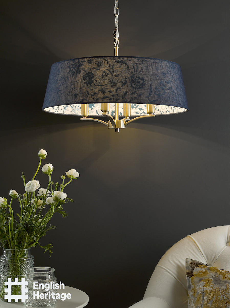 Taking inspiration directly from the blue sprigged wall paper found in the drawing room of Down House, the former home of the great Charles Darwin. The Down House 4-light Pendant in polished nickel features an Arts & Craft style blue sprigged patterned interior with a darker complimenting blue linen outer.