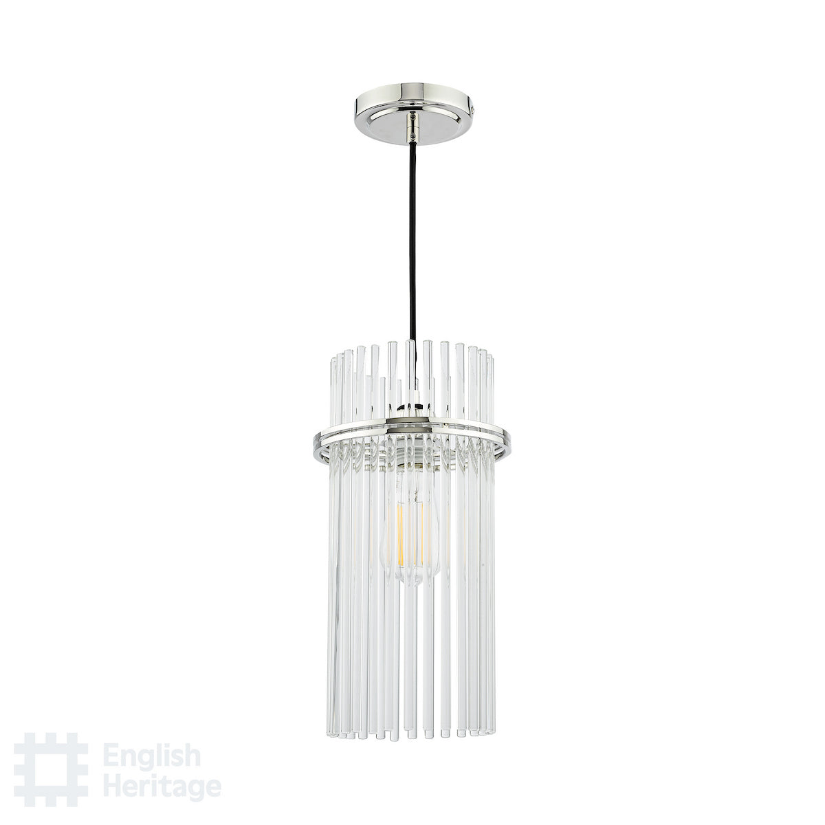 The Eltham Rodded Glass and Nickel Lantern makes a great Art-Deco Statement in any room. With a glorious ring of glass rods and a double nickel ring. Fitted with 1 metre of black fabric cable, which is height adjustable on installation. designers worked hard to bring a taste of 1930s glamour to your home with these opulent swagged crystal lamps and geometric forms inspired directly by this Art Deco jewel. The use of polished nickel metalwork coupled with a subtle yet stylish surface flourish serves as a counterpoint to the glass.
