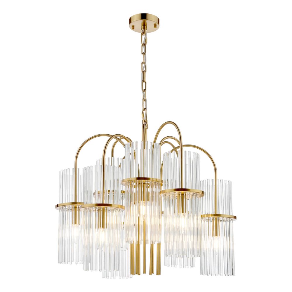The Eniola 9 Light Chandelier is a stunning lighting fixture that adds elegance and charm to any home decor. With its nine individual pendant lights, this fixture creates a beautiful cascading effect, illuminating the space with a warm and inviting glow. The natural brass finish gives it a timeless appeal, while the glass shades, comprised of individual glass rods, add a touch of sophistication. This pendant is perfect for various areas within the home, such as the dining room, living room, or grand entrance hall, where it can be hung in a prominent position to become a focal point of the space. Whether used solo or grouped together, the Eniola Pendant effortlessly brings a touch of luxury and style to any interior.