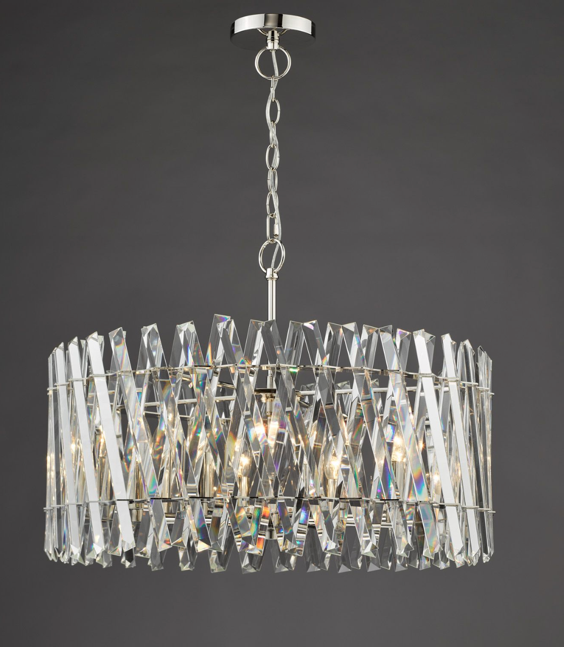 Illuminate your space with the stunning Entwine 8 Light Pendant from dar lighting. This crystal ceiling light marries polished nickel with criss-cross faceted crystal, creating a dazzling display that's sure to catch the eye. As light dances through the intricate crystal design, it casts enchanting patterns across your room, transforming any space into a sparkling wonderland. The Entwine pendant isn't just a light fixture; it's a statement piece that effortlessly blends modern and classic elements. Whether gracing your dining room, foyer, or living area, this crystal pendant promises to be the talking point of your home. So go on, add a touch of glamour to your ceiling and watch as this dar lighting masterpiece illuminates your world in style.