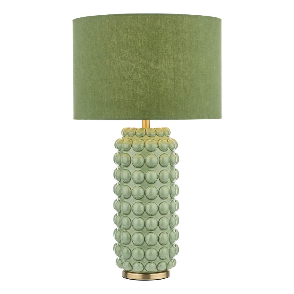 The Etzel Green Ceramic Table Lamp is a contemporary design with a tall lozenge shape covered in large bobbles, hand-glazed in olive green with antique brass metal-work, topped with a deep olive green linen shade.