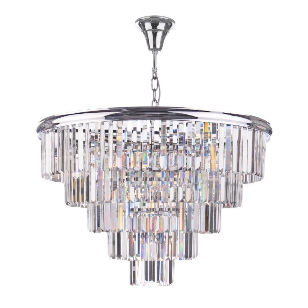 The EULALIA crystal chandelier, is the perfect statement ceiling light for a grand entrance hall, or over a large dining table. With layers and layers of beautiful coffin crystal complemented by a perfectly proportioned top metal band in polished nickel.