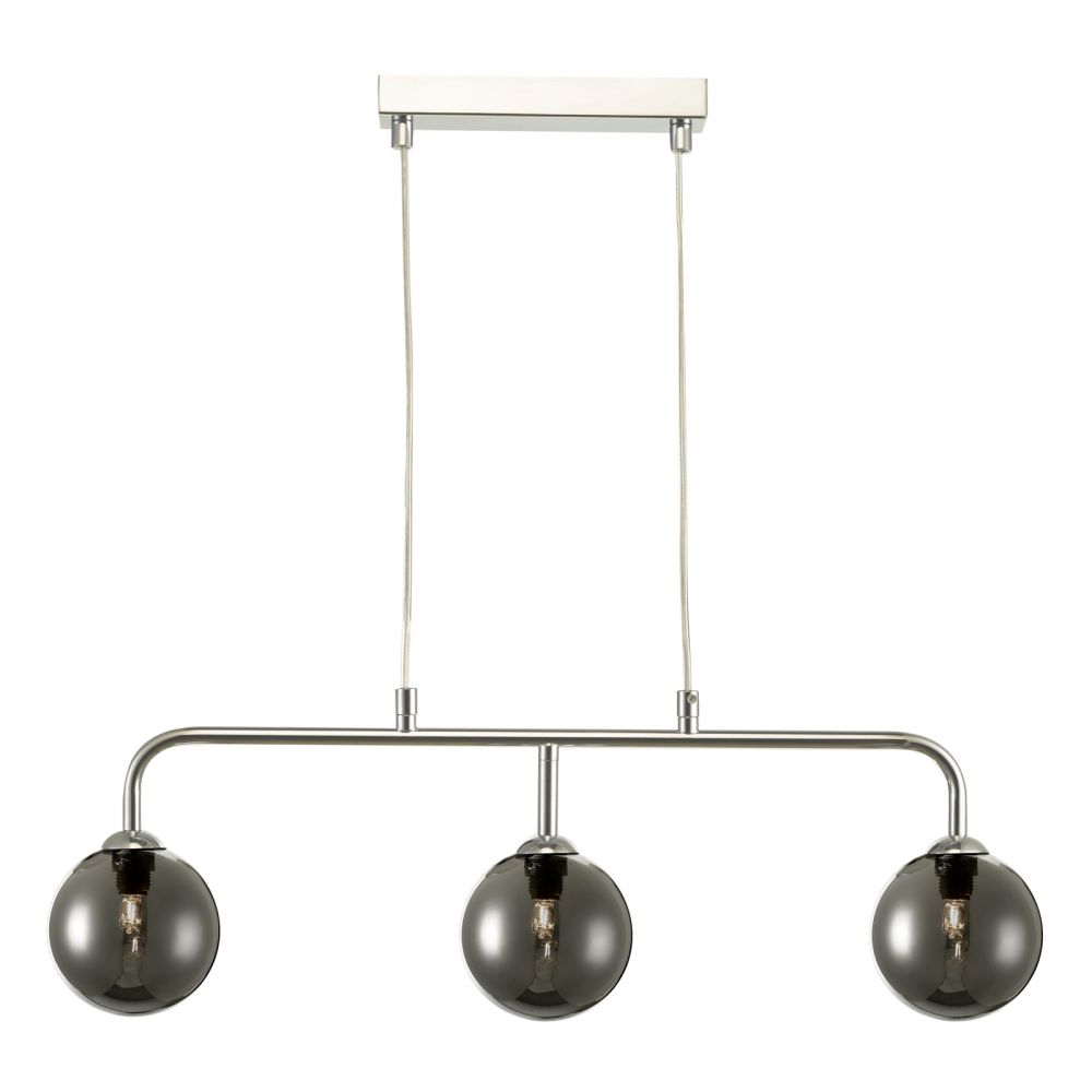 The FEYA Bar Pendant Light in polished chrome and smoked glass. With 1m of clear cable which can be shortened on installation the Feya bar pendant ceiling light can suit both high or low ceilings. The flexible cable makes it suitable for sloped ceilings such as in extensions.