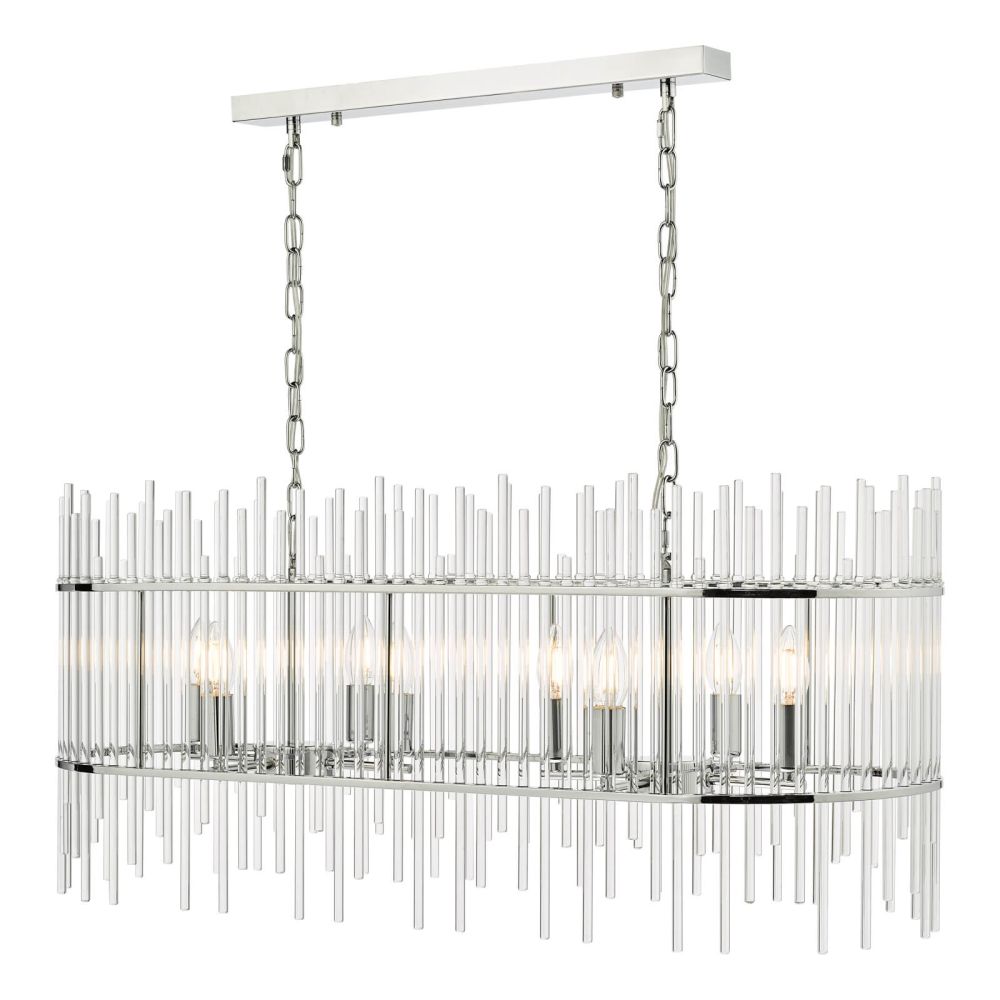 The Finola 8 light bar pendant has a contemporary feel with castellated glass rods and chrome metal work. This modern oval-shaped bar pendant looks fantastic over kitchen islands or dining tables.