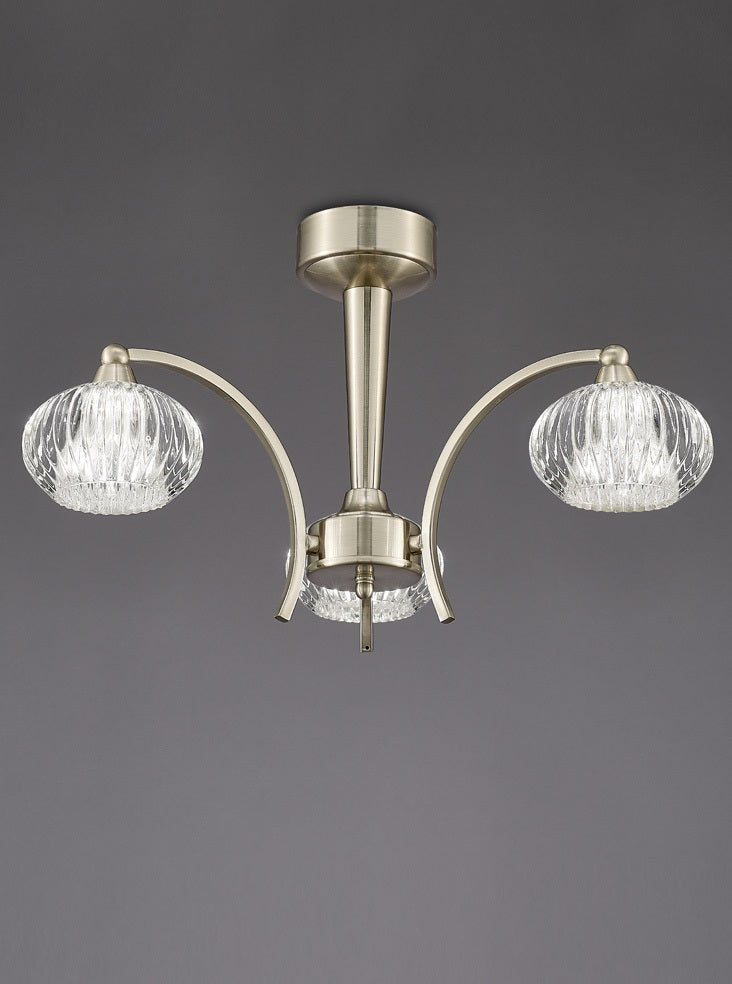Ripple 3 Light Ceiling Fitting. In satin nickel finish with small ribbed glasses. Suitable for dimming if used with mains voltage halogen lamps. LED G9 lamps may be used but suitability for dimming will depend on the lamp and switch used.