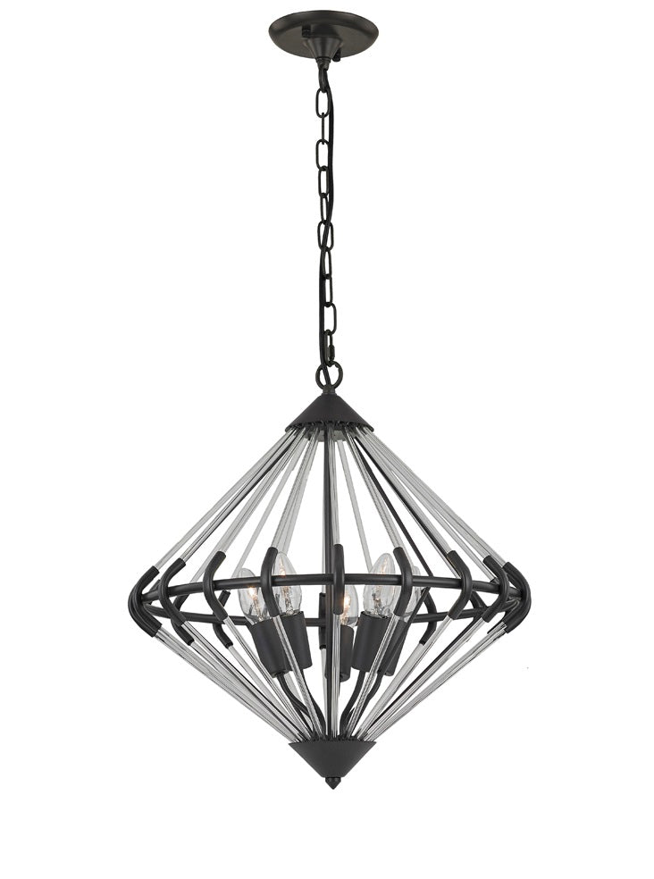 Follie 5 light Pendant In antique finish ironwork with glass rods top and bottom.