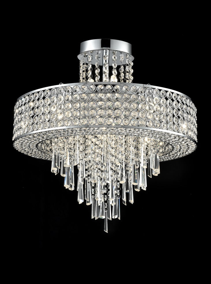 In chrome finish with a frame of open metallic circles each filled with a hexagonal crystal glass. Strings of small crystal glasses adorn the top of the fitting and a mass of crystal glass drops hang below.