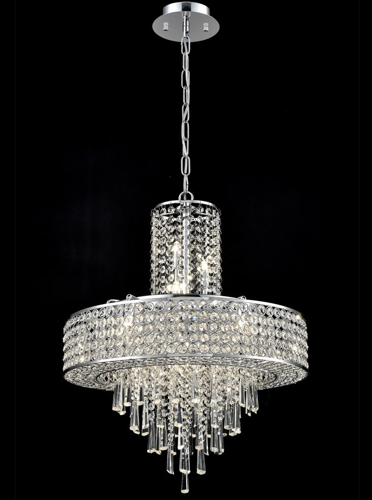 In chrome finish with a frame of open metallic circles each filled with a hexagonal crystal glass. Strings of small crystal glasses adorn the top of the fitting and a mass of crystal glass drops hang below