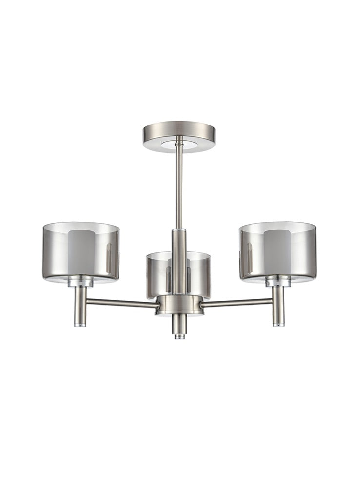 Satin nickel and chrome finish 3 light pendant with smoked glass and frosted glass diffusers to cover the lamps.
