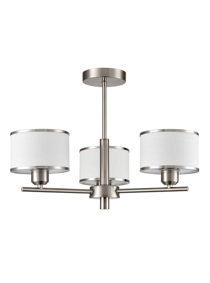 A three light fitting in satin nickel finish with off-white textured fabric shades featuring matching trims.