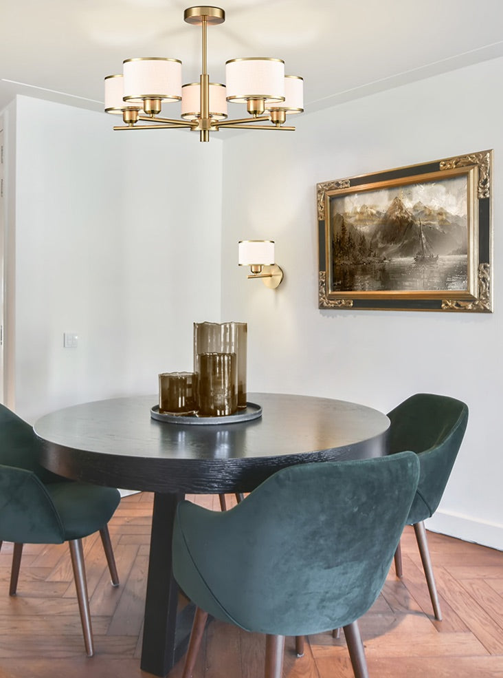 A five light fitting in aged brass finish with off-white textured fabric shades featuring matching trims.