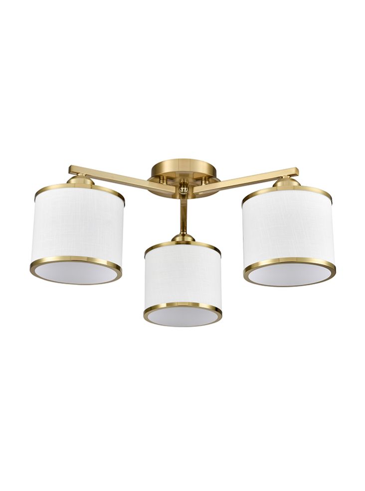 A three light fitting in aged brass finish with off-white textured fabric shades featuring matching trims. Suitable for low ceilings.
