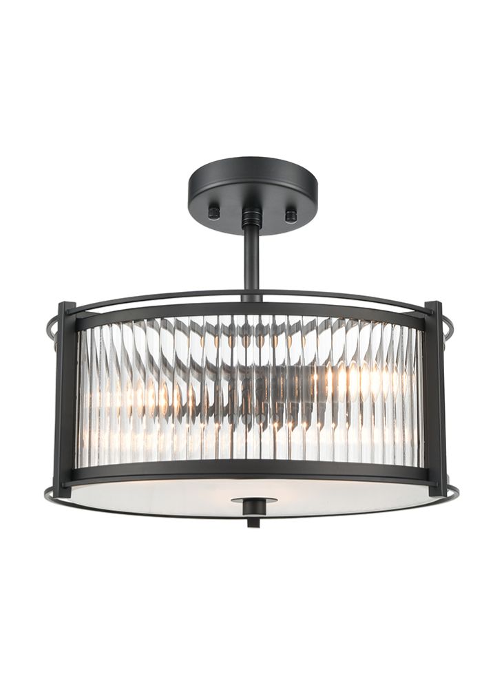 Matt black finish pendant on chain suspension with ribbed glass and a frosted glass base, can be converted to flush.