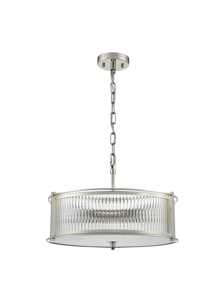 Polished Nickel finish pendant on chain suspension with ribbed glass and a frosted glass base, can be converted to flush.
