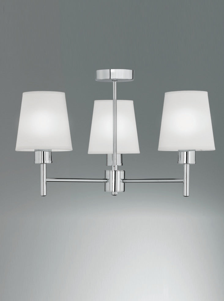 Turin 3 light fitting. perfect for low ceilings, the metalwork is chrome and its finished with cream fabric shades.