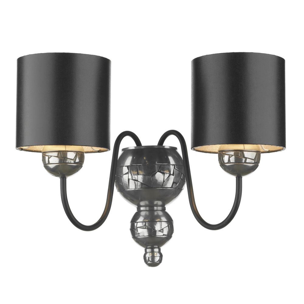 Finished with a polished pewter faceted components and black metalwork, it comes complete with black card shades.