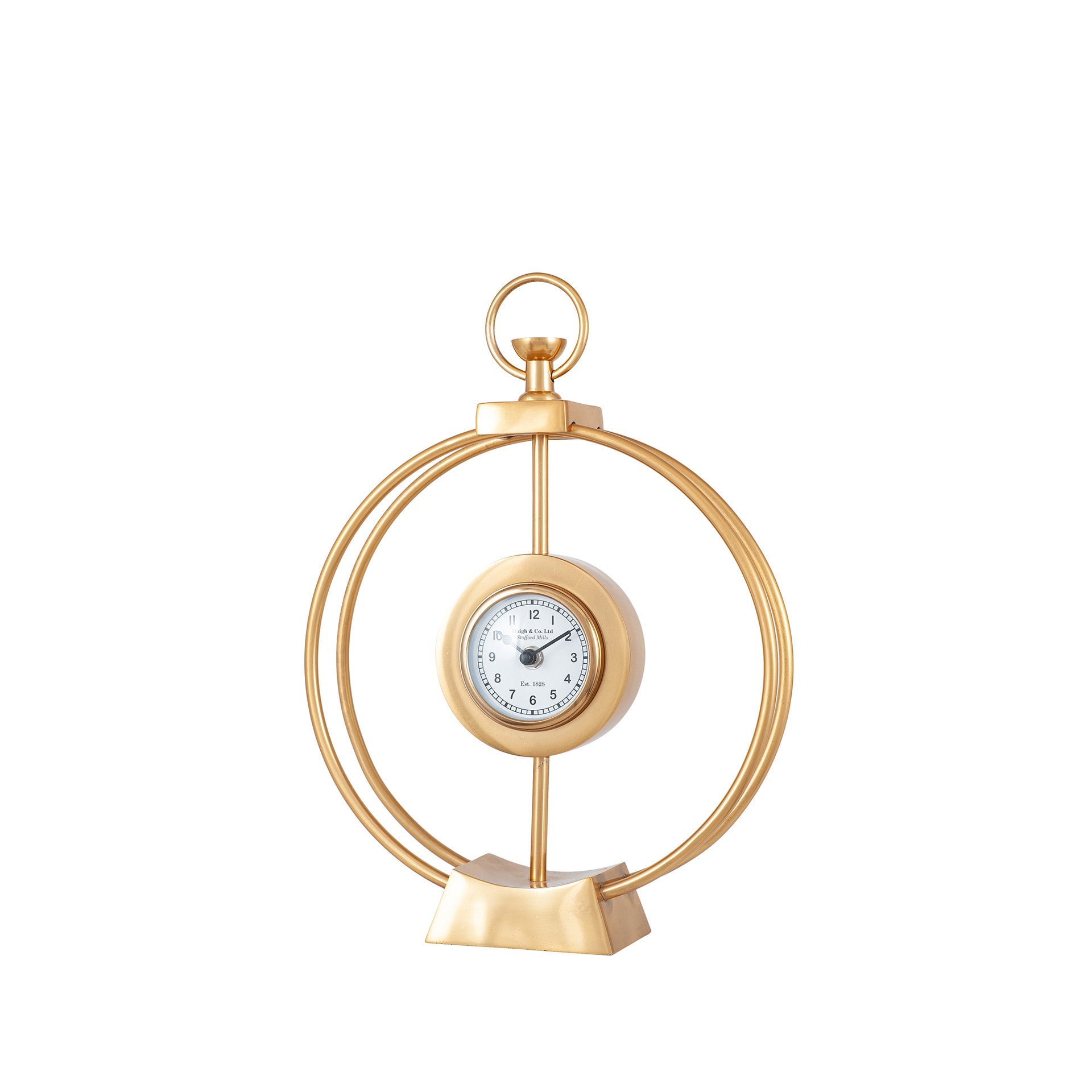 This striking desk clock is housed within a double circular metal frame. The well proportioned, white faced clock is suspended centrally for maximum impact. Beautifully finished in gold metal, add this stunning time piece to any desk, console table or mantlepiece.