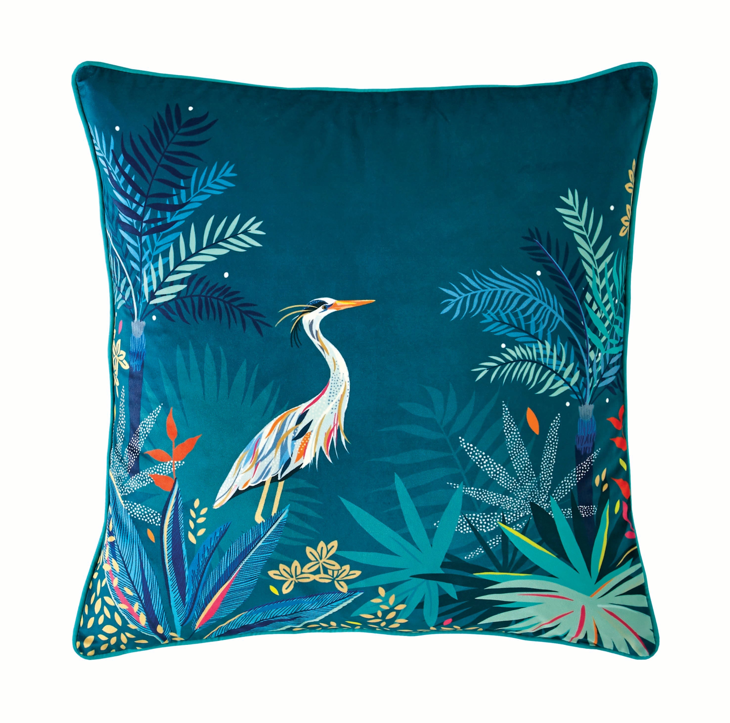 This Teal Heron Feather Filled Cushion by Sara Miller London is a striking home accessory. This sumptuous velvet cushion features a beautiful bird amid eye-catching exotic foliage. Working either to complement our bedding range and other cushions, or as a statement piece in its own right, this distinctive design is certain to add a splash of colour to your home.