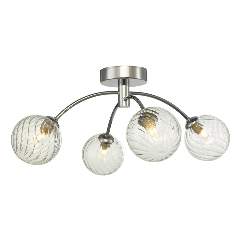 The Izzy 4 light semi flush ceiling light in polished chrome and twisted glass. The polished chrome metal work and twisted blown glass add a premium feel to this semi flush ceiling light.