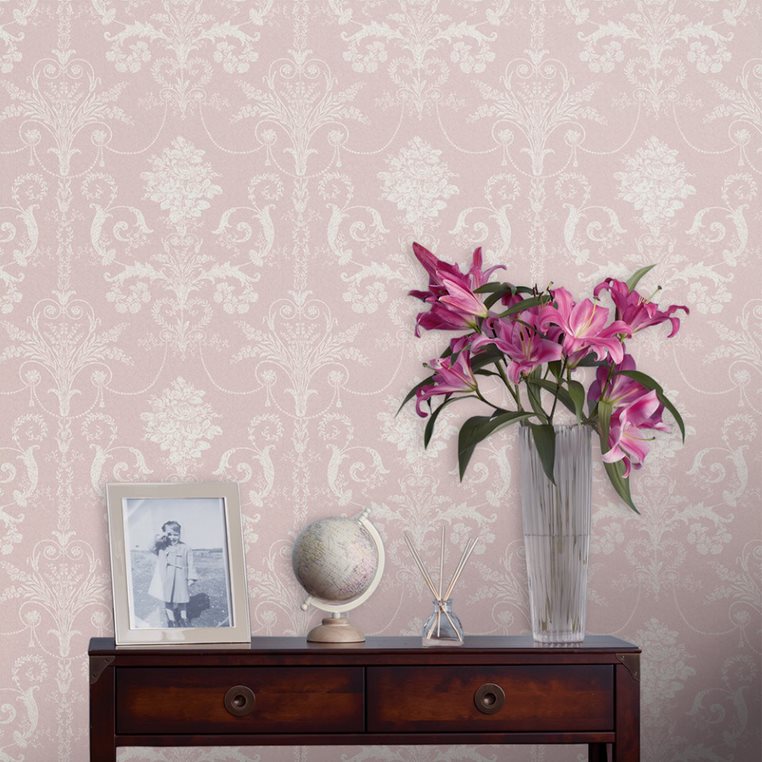 This chic French toile-inspired damask design looks fresh and modern with a matt finish and amethyst coloured background.