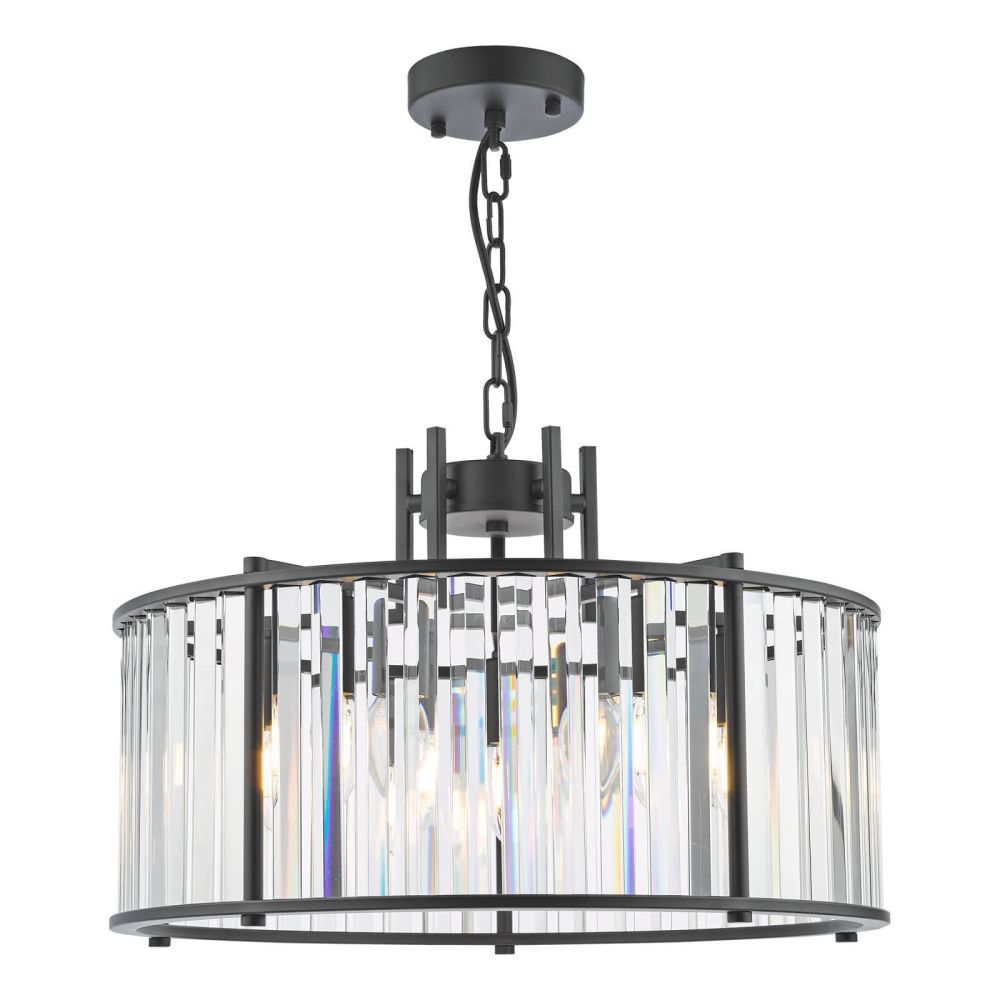 The stunning Kiran 5 Light Pendant features a Satin Black frame that exudes elegance and sophistication. The faceted glass adds a touch of glamour and creates a mesmerizing visual effect when illuminated. Suspended from a matching chain, the Kiran Pendant is perfect for adding a contemporary touch to any space no matter your ceiling height. Whether it's suspended over a dining table or in an entryway, this pendant instantly becomes the focal point of the room.