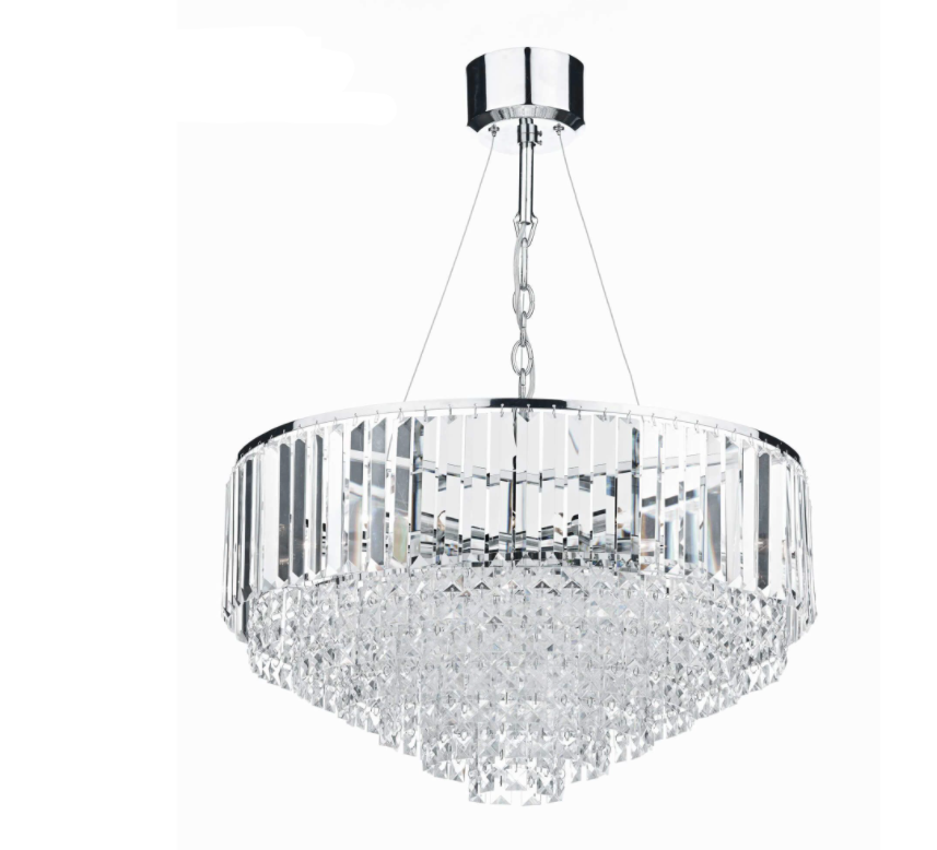 Finish in Polished Chrome with crystal droplets its a grand chandelier and will add a touch of magnificence to your room.