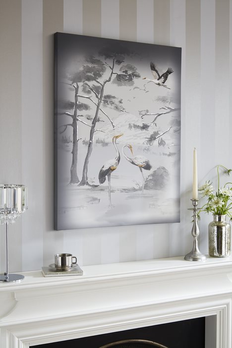 Laura Ashley inspired by the animalia collection A printed canvas embellished with metallic foil highlights and embroidery detail, featuring the graceful cranes in flight from the Animalia wallpaper.