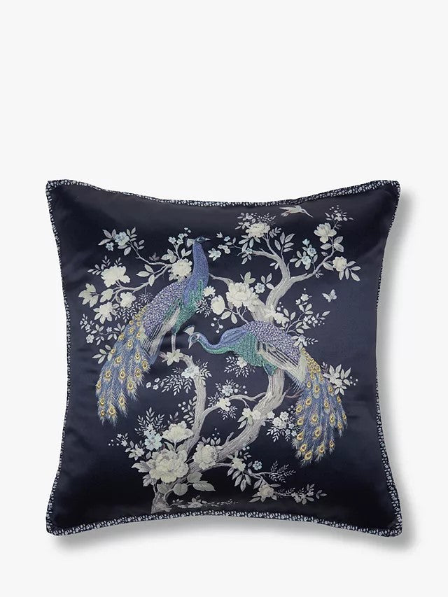 In a rich midnight hue, the Belvedere embroidered cushion has been beautifully printed and embroidered with the Laura Ashley Belvedere peacock design. With elegant tails curving between branches of classic florals, this cushion brings traditional luxury to soft furnishings. It is filled with its own plush pad and finished with a subtly patterned trim.
