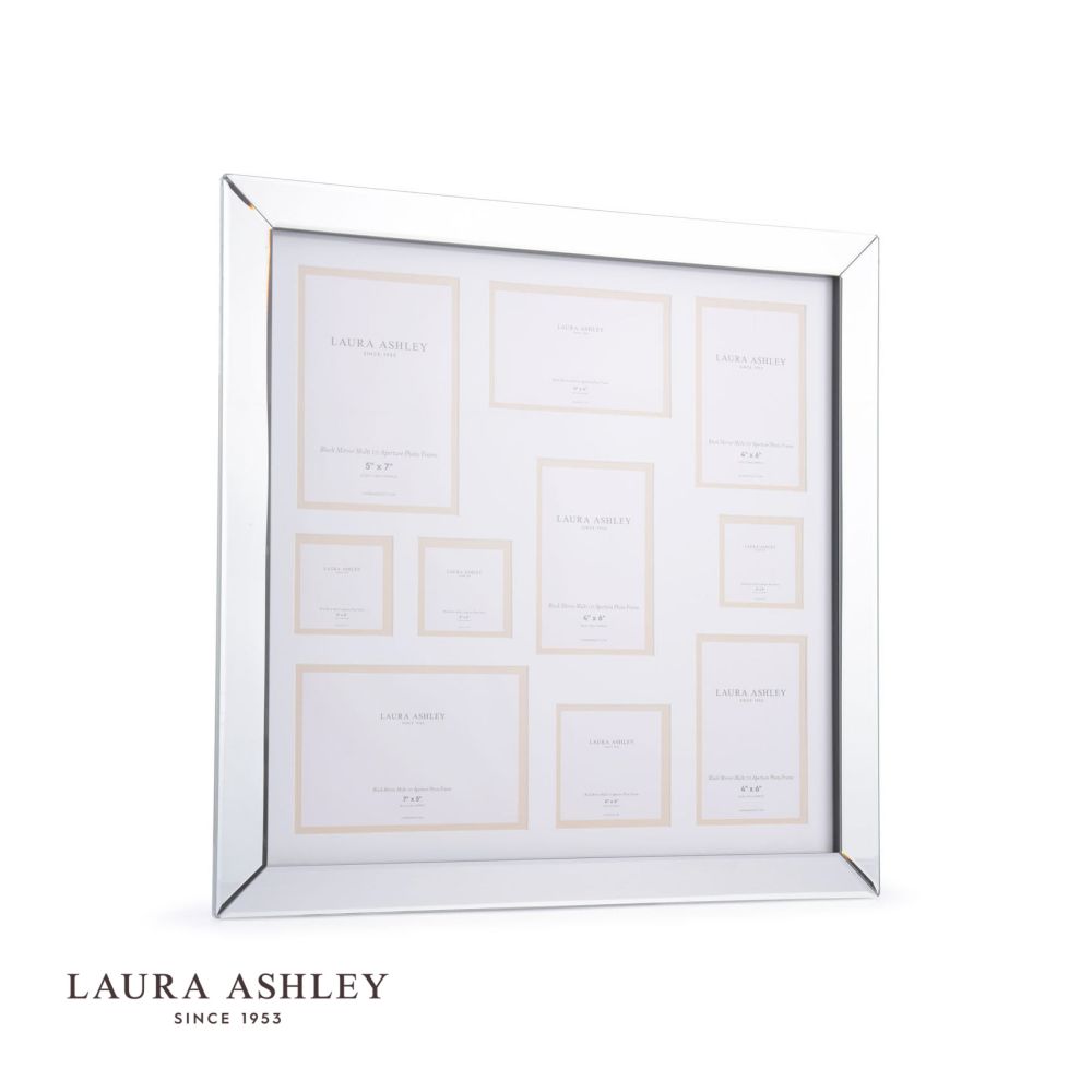 With every edge covered in beautiful clear mirrored glass with luxury bevelled edges, this large multi aperture photo frame from Laura Ashley will show off your favourite photographs or other images. Featuring 10 apertures for photos of varying standard sizes in a balanced arrangement within a block frame designed to be hung on the wall for a delightful display. The reverse has a black velvet backing and is fitted with hooks for hanging on the wall in either a portrait or a landscape orientation. Holds 10 photos.
