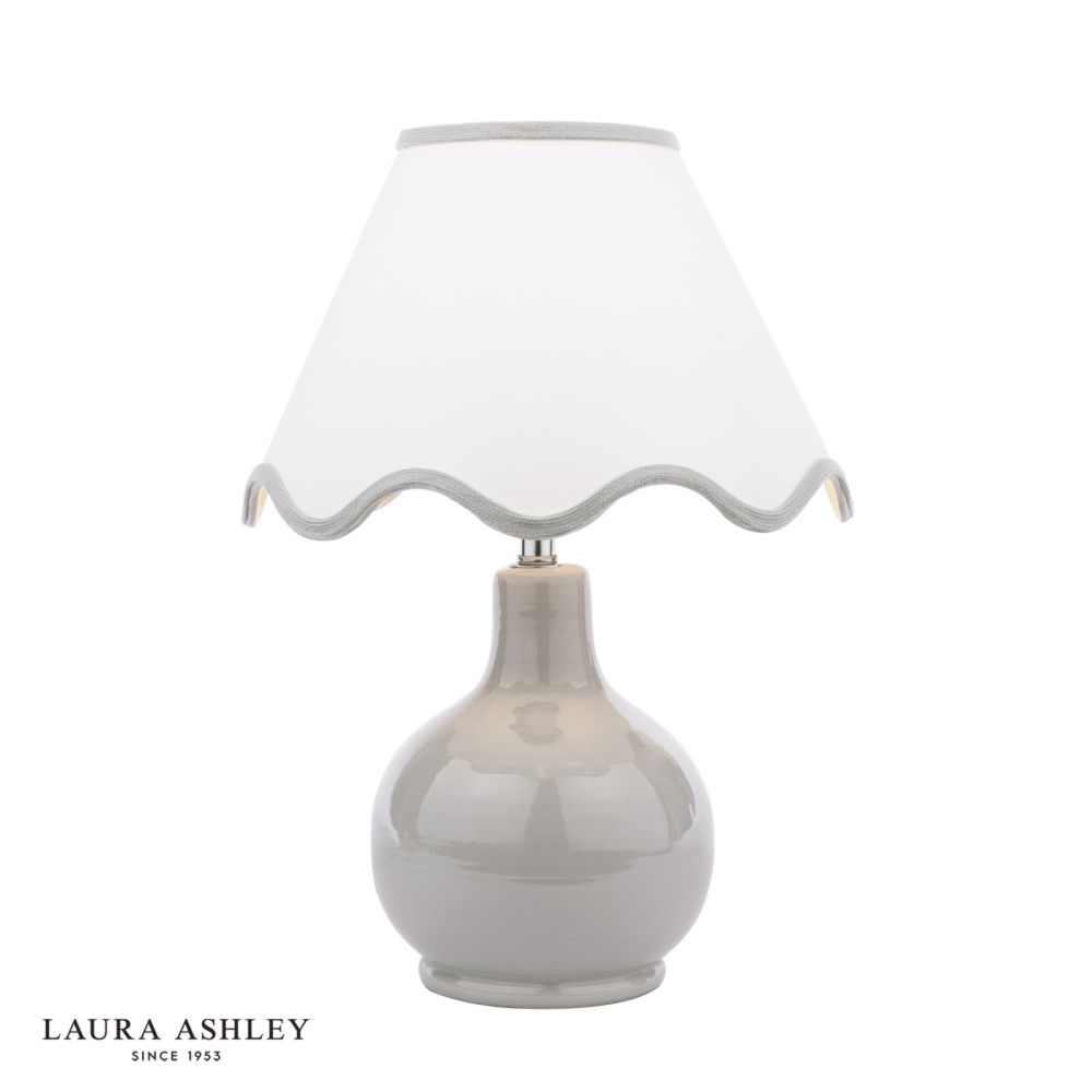 The Laura Ashley Bramhope Table Lamp effortlessly elevates any space, making a perfect addition to any bedside table, desk or sideboard. This gorgeous lamp features a sleek grey ceramic base with a complementing white shade with grey scalloped trim. Perfect for placing on an end table or bedside nightstand, the lamps compact size makes it perfect for smaller areas while still delivering ample lighting.