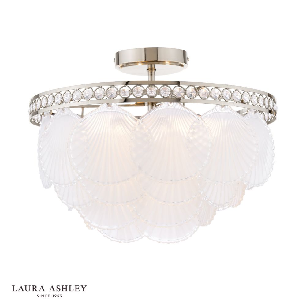 Undeniably elegant, the Laura Ashley Caverton 4 Light Semi Flush is perfectly suited to enhance modern living rooms and bedrooms, featuring a polished nickel frame. With its low-profile semi-flush mount design, this gorgeous ceiling light includes glass droppers ribbed with a sparkling finish that cast a radiant glow, elevating any space.