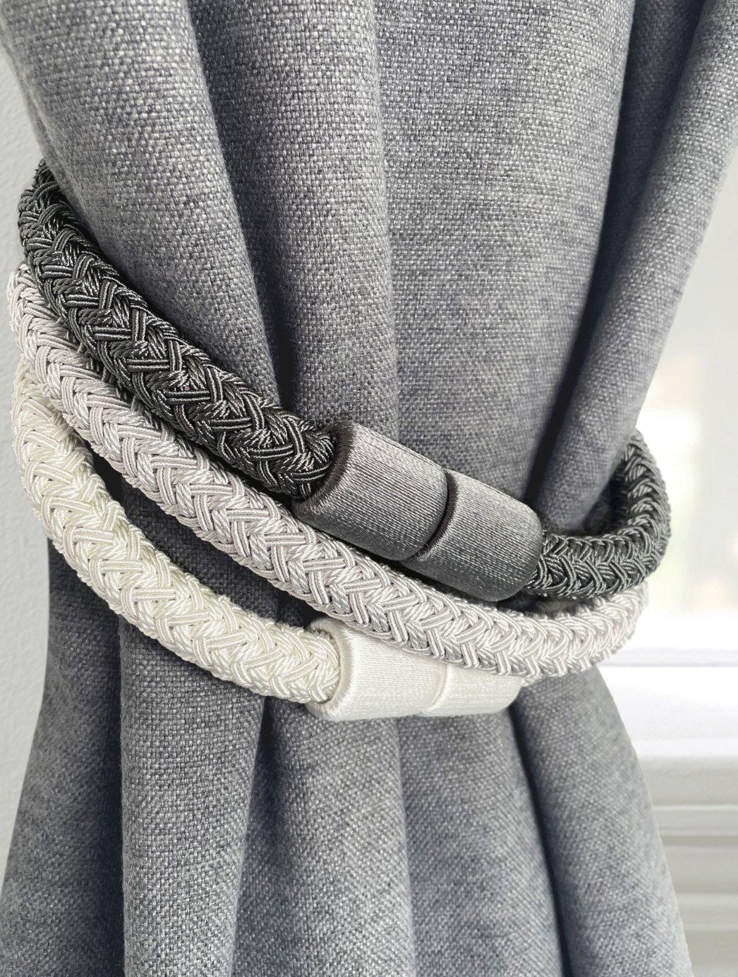 Contemporary, magnetic rope tiebacks with intricate braided detail and a luxurious sateen finish. These stunning Laura Ashley tiebacks use magnets to create a loop that embraces your curtains so these is no need to drill a hole into the wall for a curtain hook. Warning! Not suitable for children under 42 months.