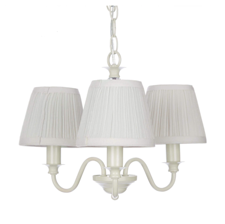 A classic 3 Light designed for Laura Ashley a great price and the shades are included, finished in a sophisticated satin cream hue , our classically styled Ellis Chandelier is a traditional look with a clean finish. Because of its light colour it is versatile enough to work into contemporary or traditional theme with equal ease.